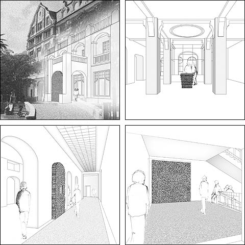 2. aus Objekten, die an exemplarischen Stellen auf die veränderten räumlichen Zusammenhängen des Gebäudes hinweisen. An exemplarischen Stellen sollen Holzstapel errichtet werden die auf die Veränderung des ursprünglichen Gebäudes verweisen, wie z.B. auf die Schließung ehemaliger Durchgänge.