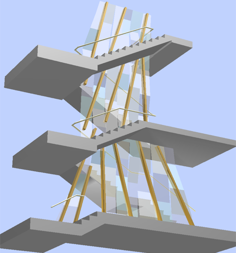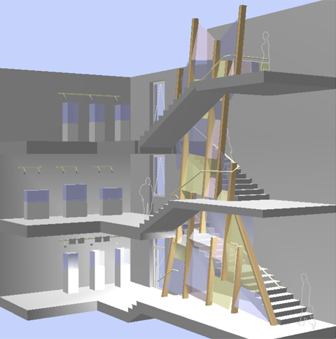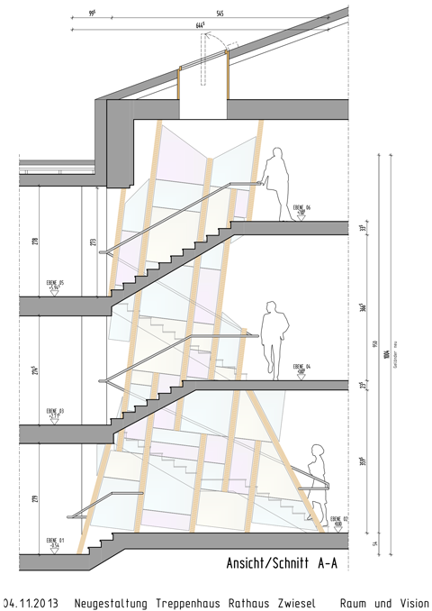 Treppenhausgestaltung Rathaus Zwiesel Das Rathaus Zwiesel ist ein klassizistisches Gebäude, errichtet 1883. Es wurde in den 1979er Jahren umgebaut und erweitert. Die aus der Zeit des Umbau stammende Untersicht der Betontreppe erinnert an eine Granitformation wie sie in Wildbächen zu finden ist. Entwurfsgedanke ist ein Geländer und eine Wandgestaltung zu kreieren, die an die Leichtigkeit und Bewegung von fliesendem Wasser eines Bergbaches im Frühlingslicht erinnert. Die Flurfläche soll für Präsentationen und kleine Ausstellungen genutzt werden. |